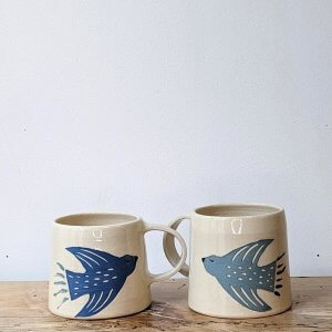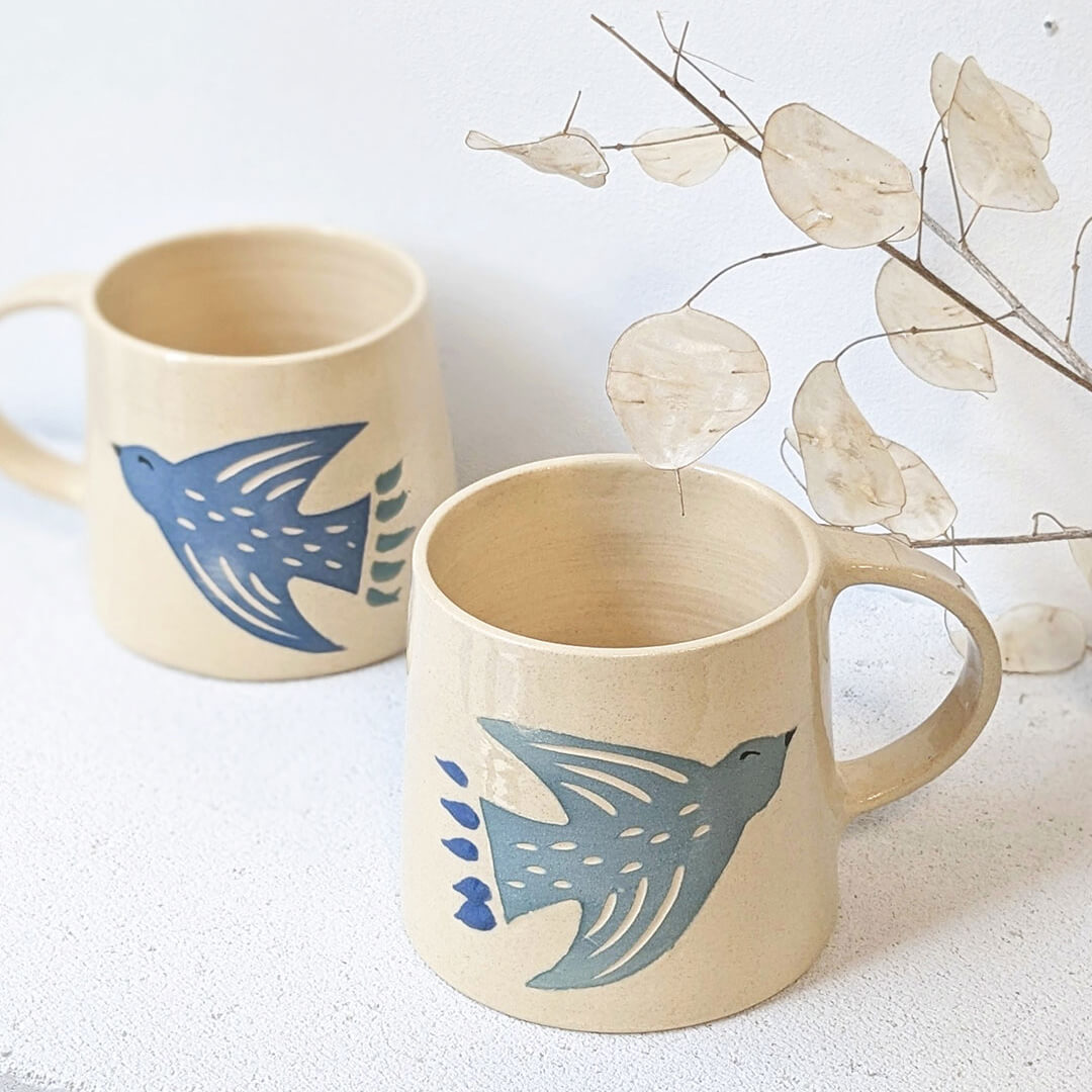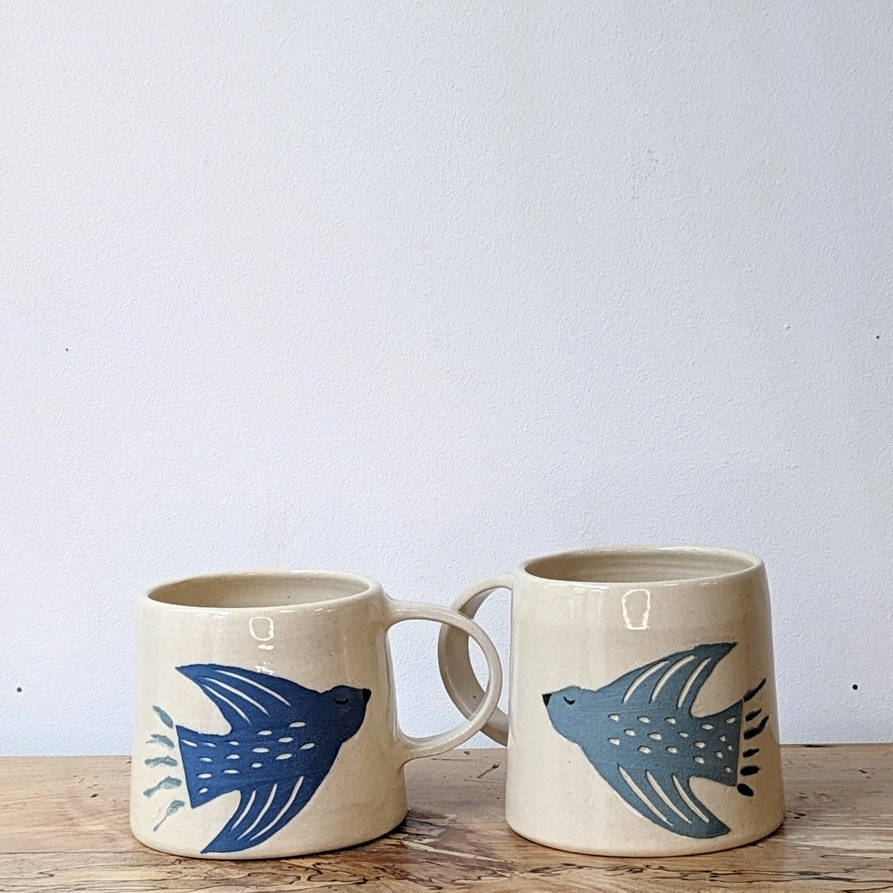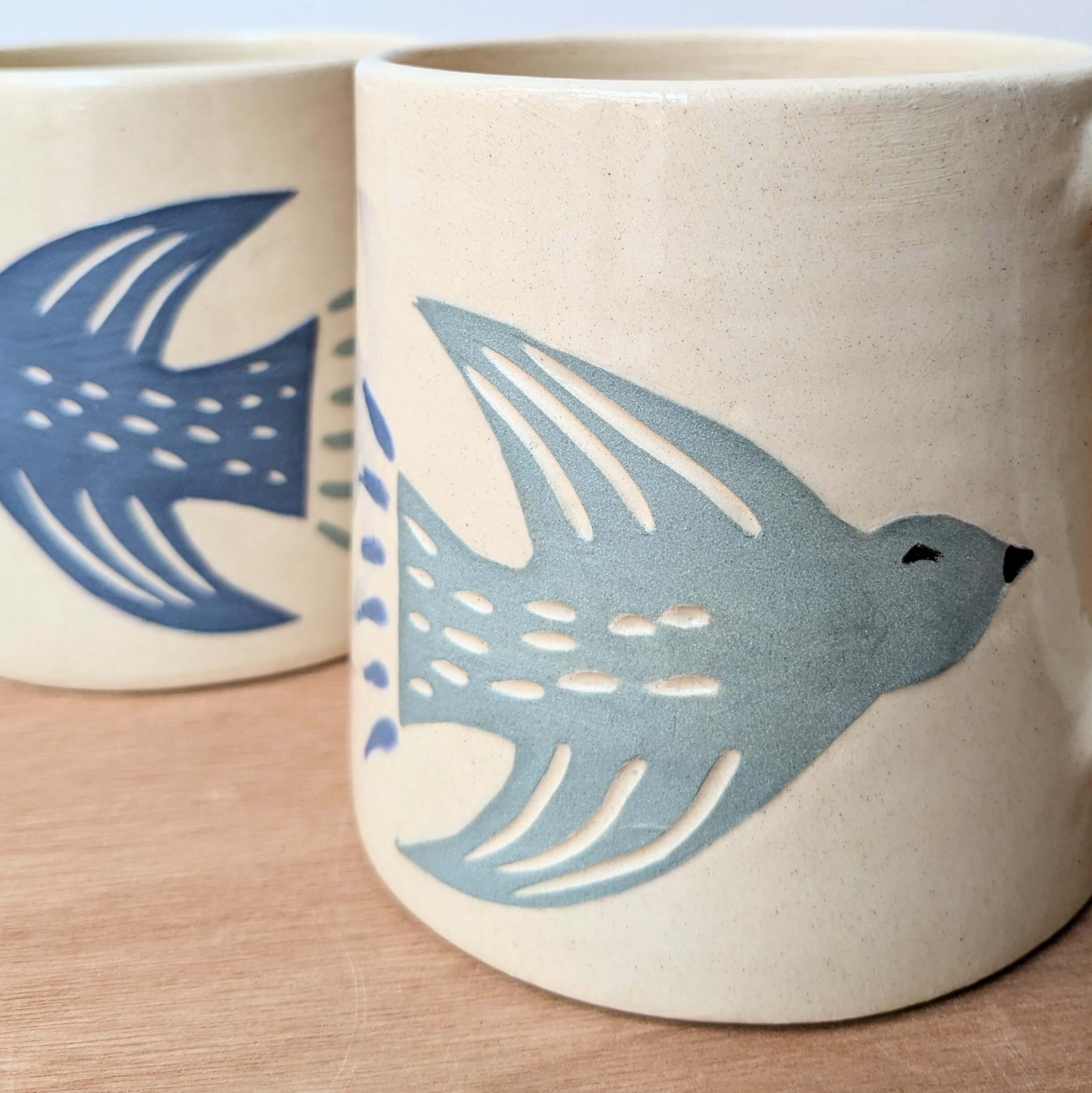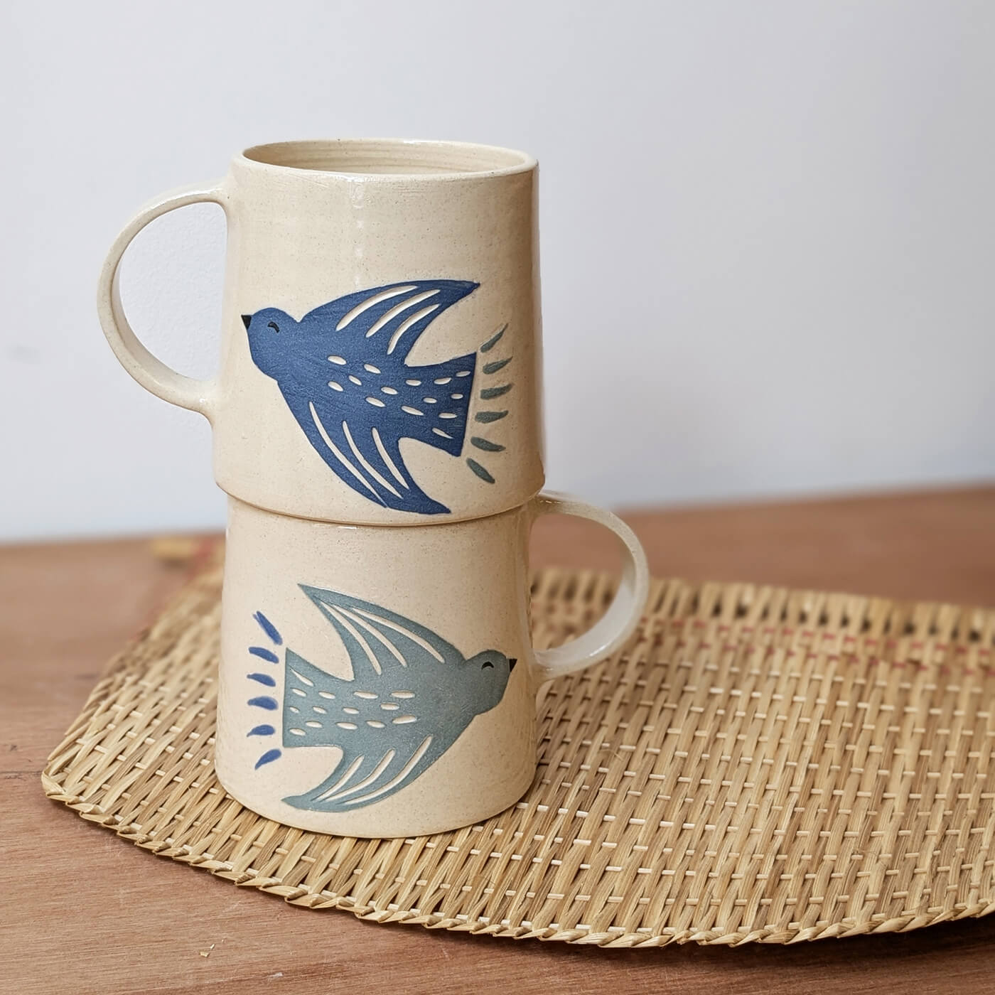 Chaque mug, réalisé au tour de potier, est bicolore, il y a deux couleurs d’oiseau sur chacun : bleu et vert. Les oiseaux sont réalisés à l’engobe coloré, leur surface est laissée brute. Le reste du mug est émaillé avec un émail alimentaire brillant.